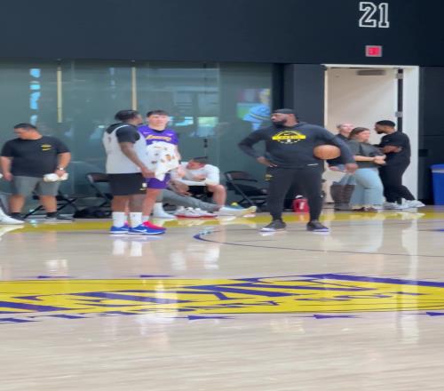 湖人训练备战揭幕战詹姆斯抱着篮球场边观摩&与教练攀谈